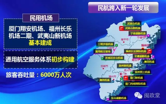 民航計(jì)劃完成投資800億,廈門翔安機(jī)場(chǎng)、福州長(zhǎng)樂機(jī)場(chǎng)二期、武夷山新機(jī)場(chǎng)基本建成,通用航空服務(wù)體系初步構(gòu)建。全省民航旅客吞吐量突破6000萬(wàn)人次。