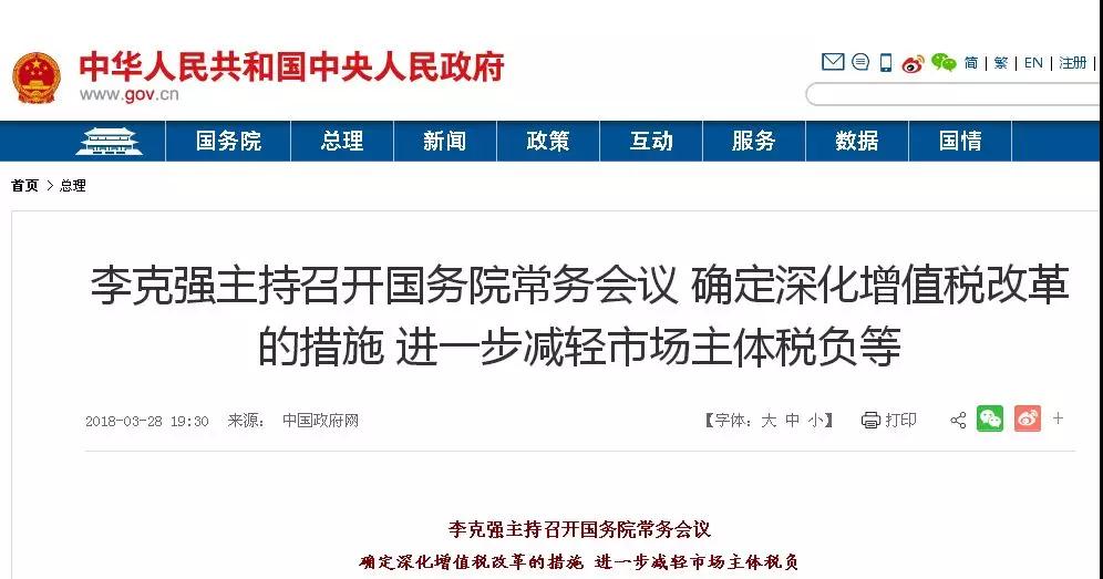 2018年3月28日國務院常務會議決定,將制造業(yè)等行業(yè)增值稅稅率從17%降至16%,將交通運輸、建筑、基礎電信服務等行業(yè)及農產品等貨物的增值稅稅率從11%降至10%,預計全年可減稅2400億元。